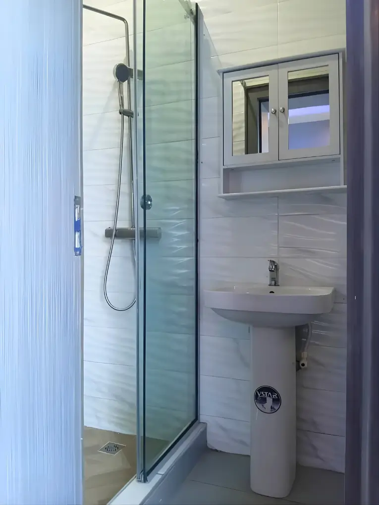 Enjoy the freedom to prepare your own meals with a built-in gas cooker, microwave, sink, and storage cabinets, all neatly integrated into the living space.