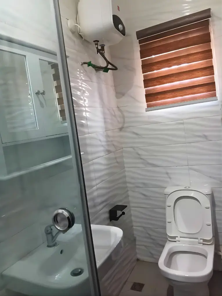 Two clean, well-tiled bathrooms featuring glass-enclosed showers, hot water supply, wash basins, and proper ventilation, everything kept fresh and spotless.