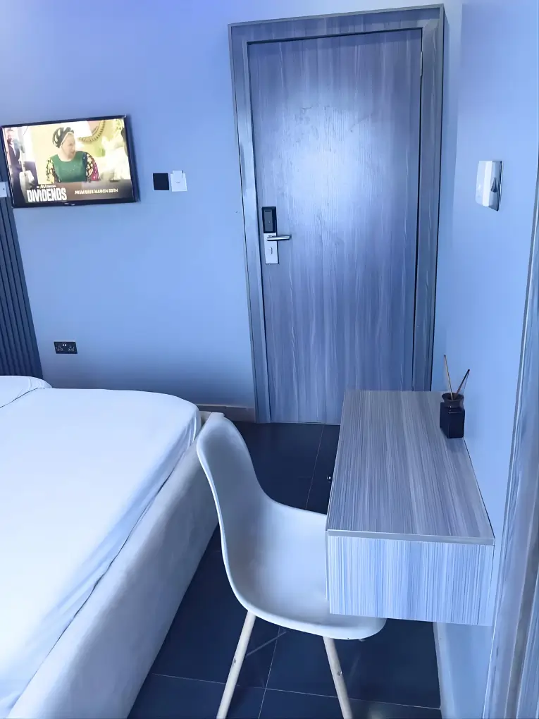 Rest easy in a well-appointed bedroom with a cozy bed, wall-mounted smart TV, work desk, and keycard entry door for your security and privacy.